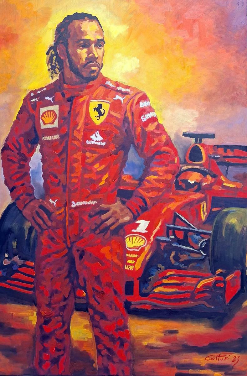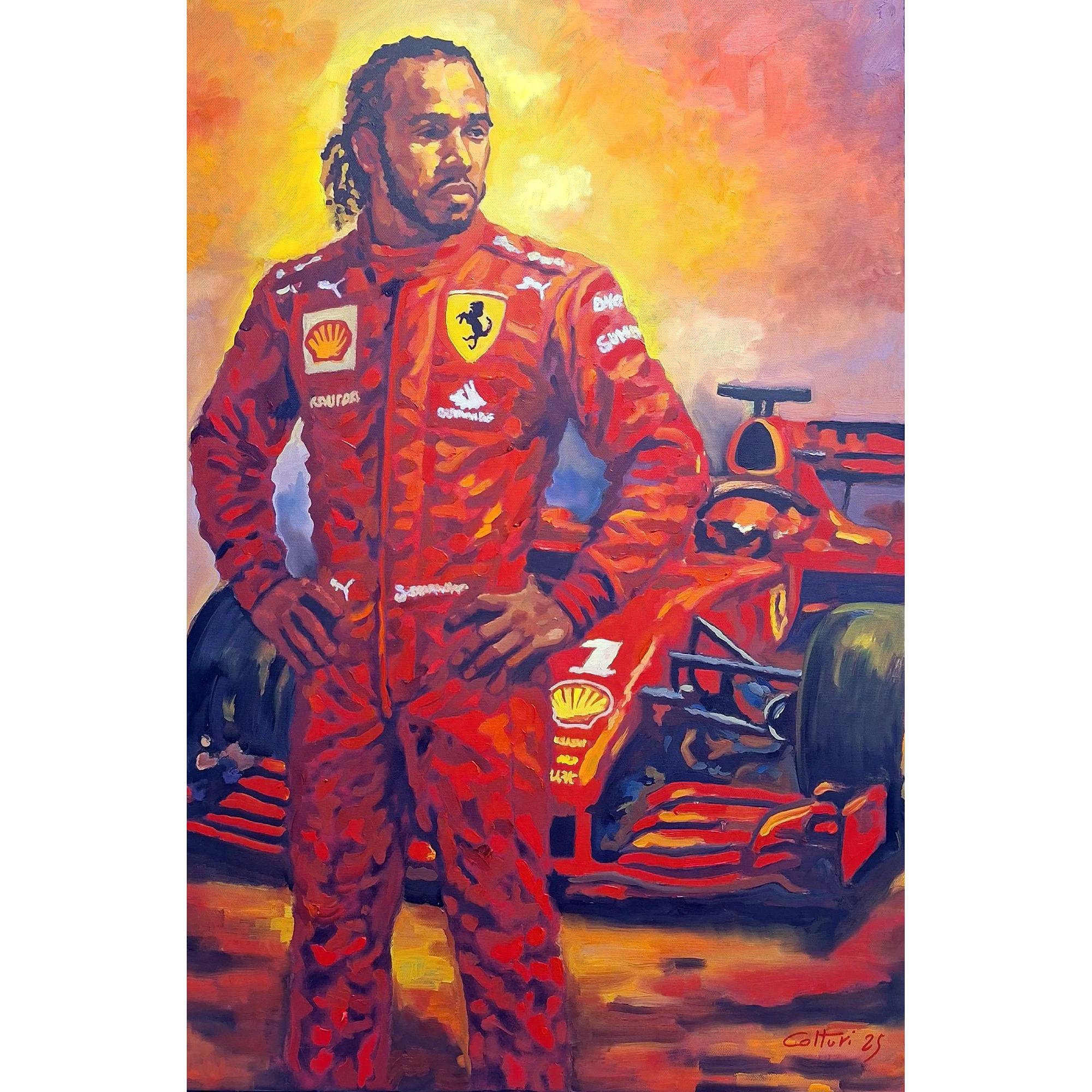 Il dipinto ritrae Lewis Hamilton in tuta Ferrari, con la monoposto sullo sfondo. Le pennellate energiche e i toni caldi del rosso e del giallo esaltano la sua figura, trasformandolo in un’icona di carisma, forza e passione per la velocità.