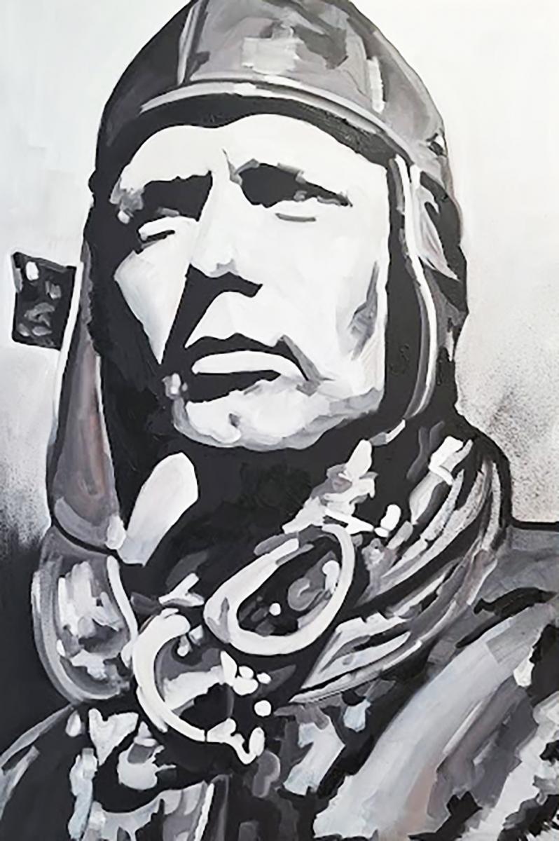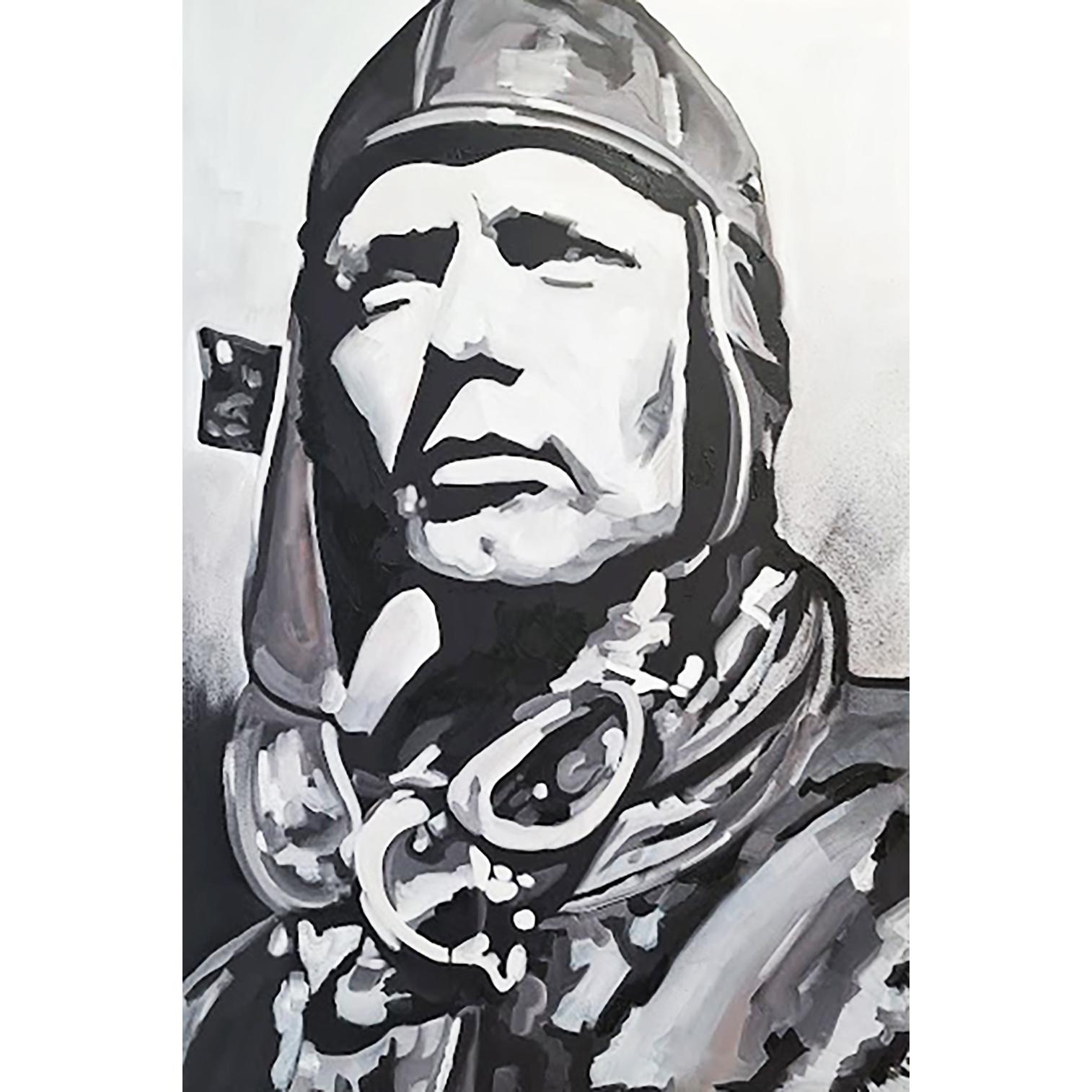 Il dipinto a olio ritrae un aviatore, rappresentato in bianco e nero con forti contrasti chiaroscurali che ne esaltano la fierezza e la determinazione. La resa stilizzata e decisa delle pennellate conferisce al volto un’aura eroica e senza tempo, evocando il coraggio e lo spirito pionieristico delle prime imprese del volo. L’opera, intensa e monumentale, trasmette un senso di potenza silenziosa e di dignità, sospesa tra memoria storica e interpretazione artistica.