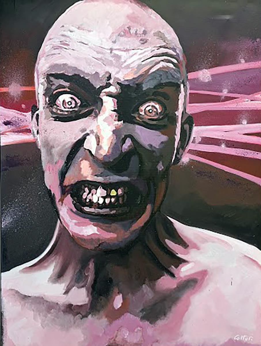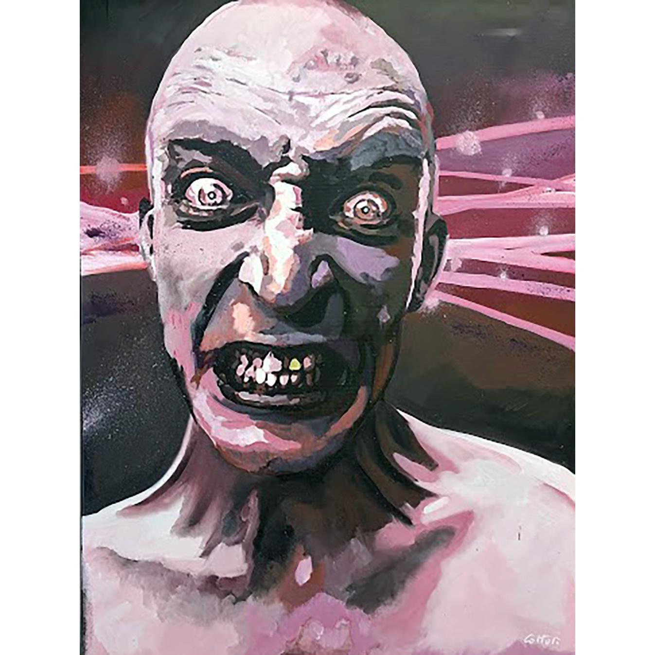 L’opera, realizzata a olio, esplora in modo crudo e viscerale il tema della tensione interiore. Il volto, deformato dall’urlo e dal tormento, cattura l’istante in cui l’energia mentale e la rabbia sembrano esplodere verso l’esterno, irradiandosi in fasci di luce che tagliano lo spazio. Le tonalità violacee e i contrasti accesi accentuano la drammaticità della scena, restituendo una sensazione di soffocante intensità. È un autoritratto emotivo, una rappresentazione diretta e senza filtri del momento in cui il controllo vacilla e l’animo si lascia travolgere dal proprio tumulto interiore.