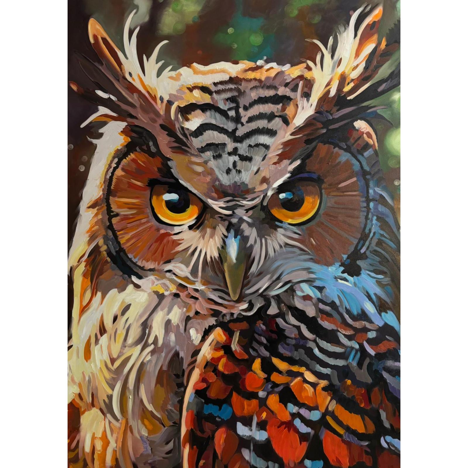 Il gufo è raffigurato frontalmente, con uno sguardo diretto e immobile che domina la composizione. La pennellata energica e stratificata costruisce una materia vibrante, dove il colore non descrive ma interpreta, trasformando il piumaggio in un campo emotivo. Gli occhi, intensi e luminosi, diventano il fulcro simbolico dell’opera: non osservano, ma vigilano. Il fondo scuro e indefinito amplifica la tensione tra presenza e mistero, restituendo un’immagine sospesa tra istinto e consapevolezza, natura e archetipo. Il gufo emerge così come figura di conoscenza silenziosa e controllo interiore.
