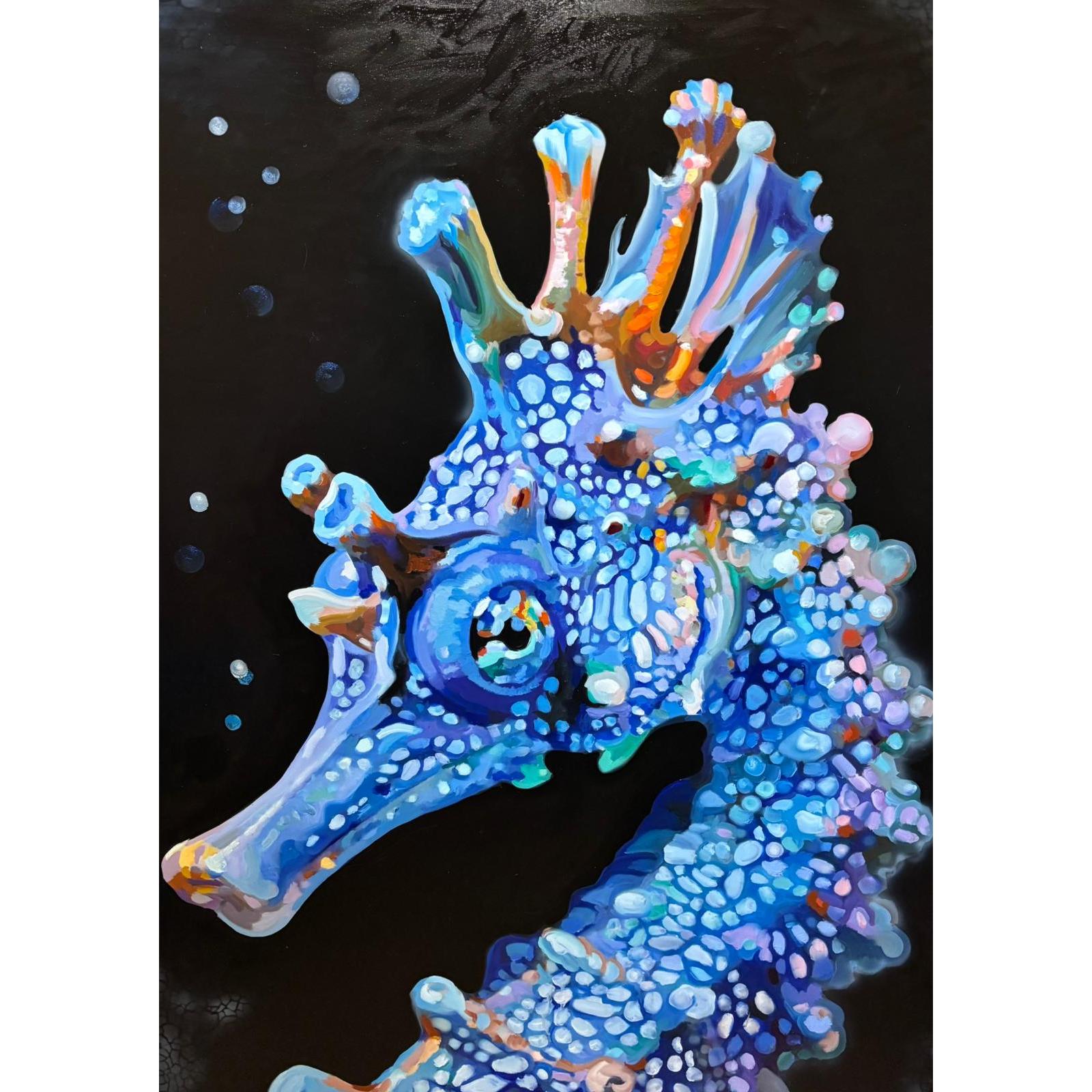 La figura emerge dal fondo nero come un’apparizione, sospesa tra realtà biologica e immaginazione. La materia pittorica, costruita per accumuli cromatici e pulsazioni luminose, trasforma il soggetto in una mappa sensibile, dove ogni punto di colore suggerisce movimento e vita latente. L’azzurro dominante rimanda a una dimensione acquatica e profonda, mentre la composizione isola la creatura in uno spazio senza coordinate, accentuandone il carattere enigmatico. Non è un ritratto naturalistico, ma una presenza simbolica: un frammento di natura che diventa metafora di alterità, silenzio e resistenza primordiale.