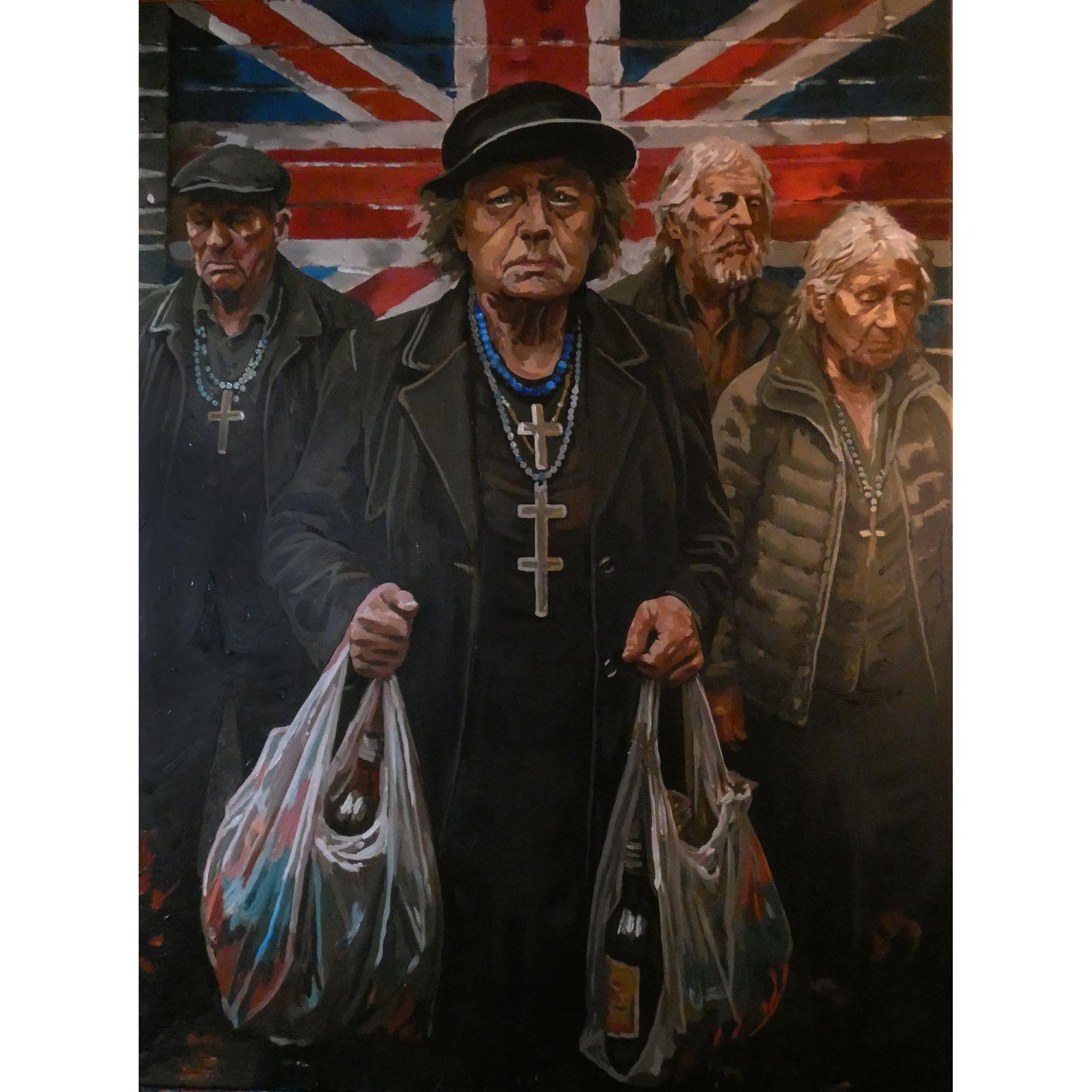 In The Last Loyalists Andrea Colturi mette in scena una comunità silenziosa, compatta ma svuotata, che avanza sotto una Union Jack ormai ridotta a fondale teatrale. I volti sono duri, segnati, impermeabili alla retorica patriottica che incombe alle loro spalle. Le croci, le bottiglie, i sacchetti della spesa diventano simboli di una quotidianità fragile, sospesa tra fede, sopravvivenza e disillusione.
