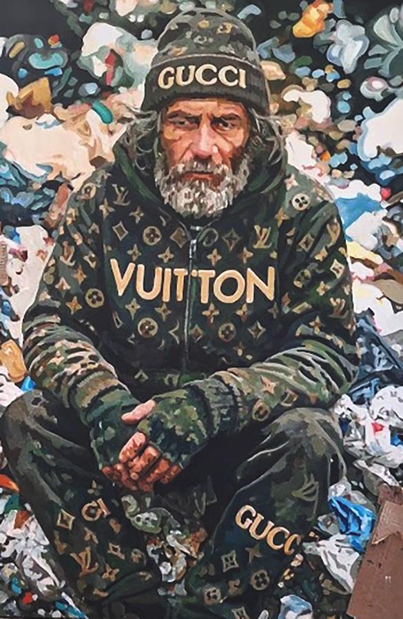 In quest’opera metto in scena una contraddizione visiva volutamente esplicita: una figura ai margini, seduta tra i rifiuti, indossa abiti segnati da marchi iconici del lusso. Il volto, scavato e stanco, guarda frontalmente lo spettatore senza mediazioni, mentre il corpo raccolto accentua una condizione di chiusura e resistenza.